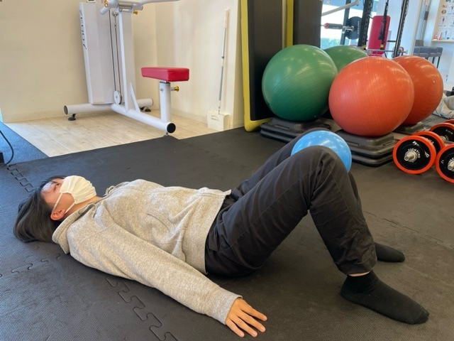 骨盤底筋エクササイズ: 仰向けになり、膝を立てた状態でボールやタオルを挟み、お尻をキュッと締めながら、お尻を上げていきます。(10回×2-3セット)