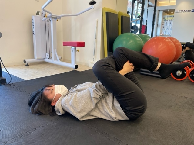 骨盤のゆがみ改善ストレッチ: 仰向けになり、両膝を抱え込むように胸に引き寄せます。(20-30秒何回でもOK)骨盤底筋のトレーニングだけでなく、お尻、足の引き締めにも繋がるトレーニングとなります。